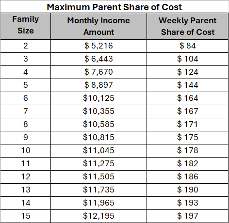 Parent Share of Cost is determined by family size, household income, and number of children in care. Please see the chart below to determine maximum parent share of cost.